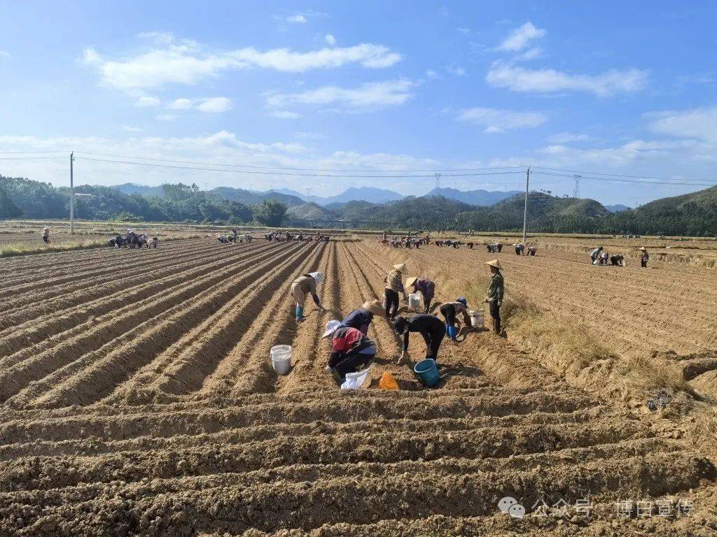 11月20日下昼,正在亚山镇安好村,记者看到,功课农机正正在地步来回功课,实行翻犁、开沟、起垄等事务。博白县洪丰种养专业互帮社结构上百名工人展开马铃薯种植,他们正正在施肥、下种、覆土、盖膜、一派冗忙的冬种现象正在田间地头缓缓开展。互帮社负担人庞英德说,马铃薯种植很有讲求,更加是下种的岁月,稍不提神就会影响马铃薯平常孕育。